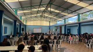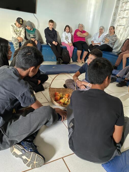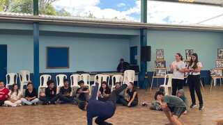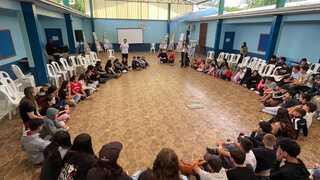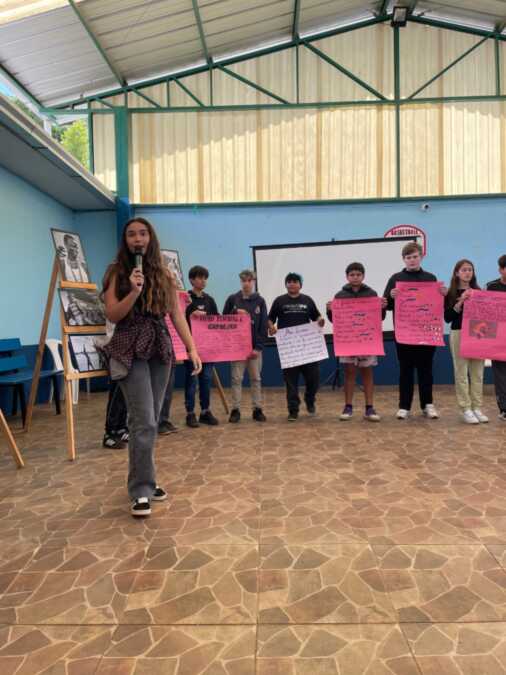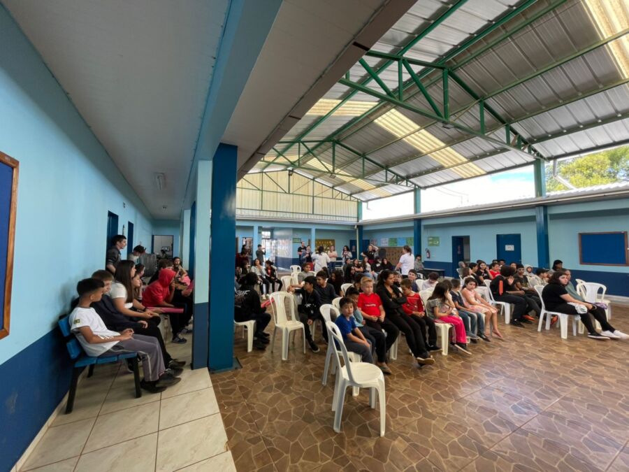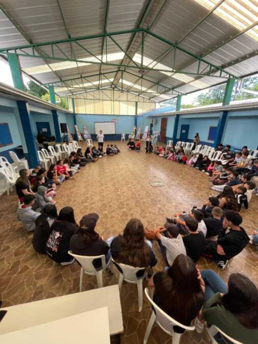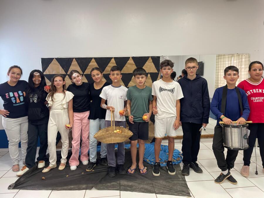 Encerrando as atividades, os alunos assistiram a uma apresentação teatral inspirada na Lenda do Ubuntu, que destacou valores como solidariedade, união, empatia e a ideia de que “eu sou porque nós somos”. A encenação da turma dos 6º anos orientados pelas professoras Vanderleia Cardoso e Elisandra Santos emocionou o público e reforçou a importância da convivência respeitosa e acolhedora entre todos.