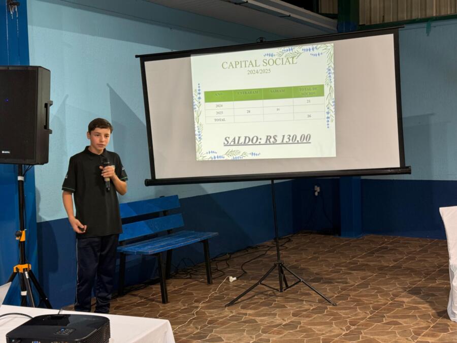 Durante a cerimônia, foi apresentado o Relatório Social com as principais atividades realizadas ao longo do ano, destacando conquistas, aprendizados e o impacto positivo das ações cooperativistas no ambiente escolar e na comunidade. Também foram apresentados os valores referentes às entradas, saídas e saldo financeiro, garantindo transparência e responsabilidade na gestão dos recursos.