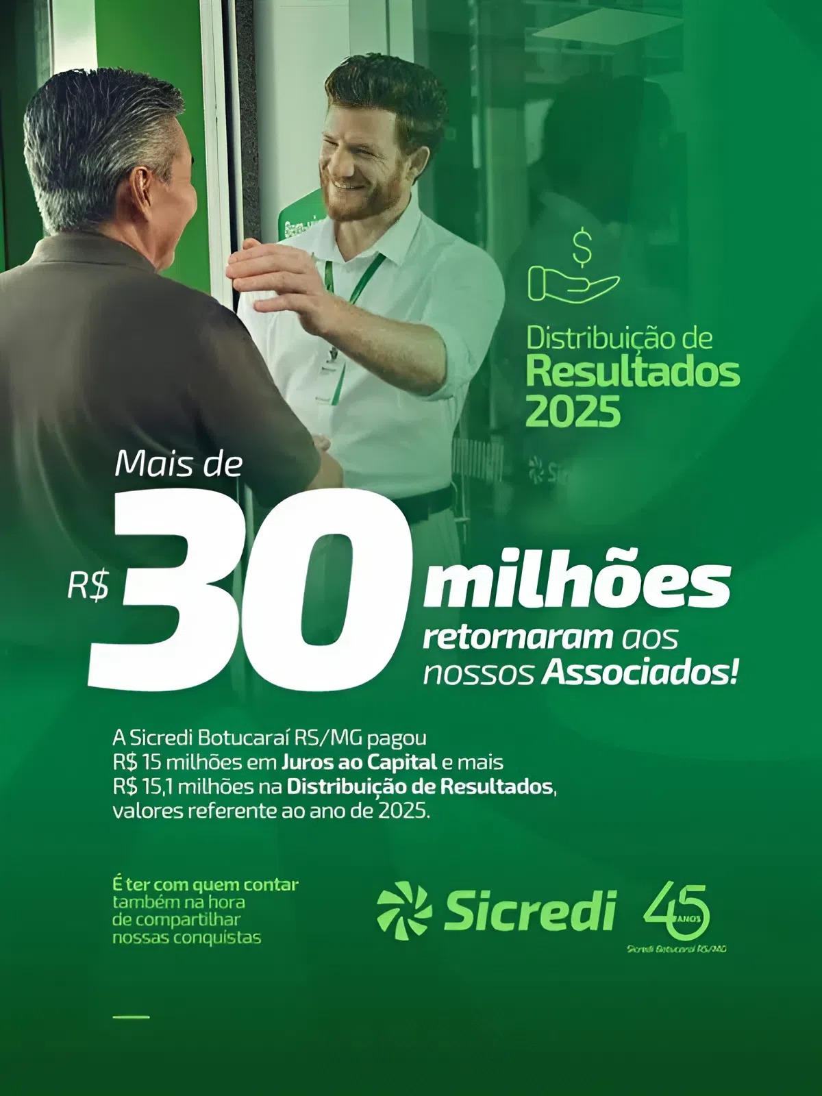 Esse crescimento sustentável também possibilita investimentos em iniciativas sociais, como o Fundo Social, no desenvolvimento de colaboradores e associados, por meio de fundos como o FATES, além de apoiar projetos que impulsionam a economia regional. Encerrando, Matuella reforça o compromisso da Sicredi Botucaraí RS/MG com o futuro. “Estamos celebrando os 45 anos da Cooperativa com resultados, crescimento e, principalmente, com o propósito de continuar ajudando pessoas do meio rural e urbano, produtores, empresas e famílias. Queremos seguir fortes, sustentáveis e presentes para apoiar o desenvolvimento da nossa região”, conclui.